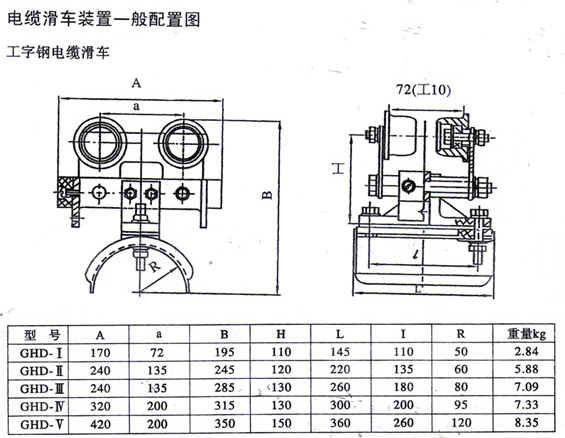 GHD-II型工字鋼電纜滑車用于移動(dòng)供電機(jī)械在移動(dòng)中電纜的懸吊與移動(dòng),已廣泛應(yīng)用于各類起重機(jī)械中。工字鋼電纜滑車該裝置具有結(jié)構(gòu)堅(jiān)固。移動(dòng)靈活。安全可靠等優(yōu)點(diǎn)滑車由牽收引滑車、電纜滑車、終端滑車三部分組成,牽引滑車跟隨移動(dòng)機(jī)械導(dǎo)纜(牽引)裝置,每個(gè)移動(dòng)機(jī)械配1個(gè),隨移動(dòng)機(jī)械往返運(yùn)行。中間電纜滑車將電纜懸掛在工字鋼軌道范圍內(nèi)隨牽引滑車移動(dòng),兩端并裝有緩沖撞頭,滑車視移動(dòng)長(zhǎng)度不同而定數(shù)量。終端滑車固定在工字鋼導(dǎo)軌末端,一般每個(gè)移動(dòng)機(jī)械設(shè)置1個(gè)。工字鋼電纜滑車該系列滑車分Ⅰ、Ⅱ、Ⅲ、Ⅳ、Ⅴ五種型號(hào),如用戶采用12#、14#、16#或更大號(hào)數(shù)工字鋼,可在訂貨時(shí)注明,本廠可成套供貨。